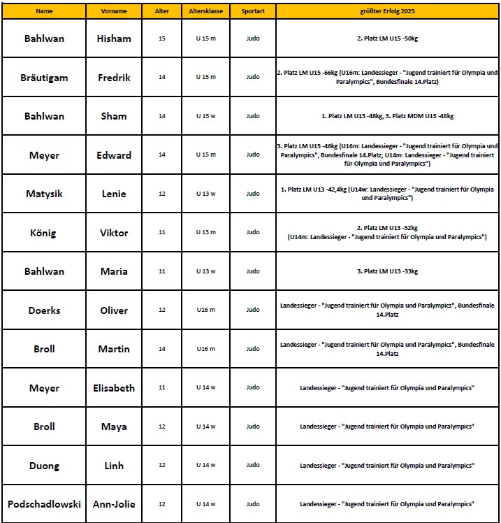 Der Nachwuchs des Judo-Club Burg e.V. war mit insgesamt 13 Nachwuchssportlern vertreten: Im Jahr 2025 erkämpften sich die jungen Talente insgesamt 16 Medaillen bei den Landeseinzelmeisterschaften sowie bei der Mitteldeutschen Einzelmeisterschaft. Ein Erfolg, der die kontinuierliche und intensive Trainingsarbeit eindrucksvoll widerspiegelt.